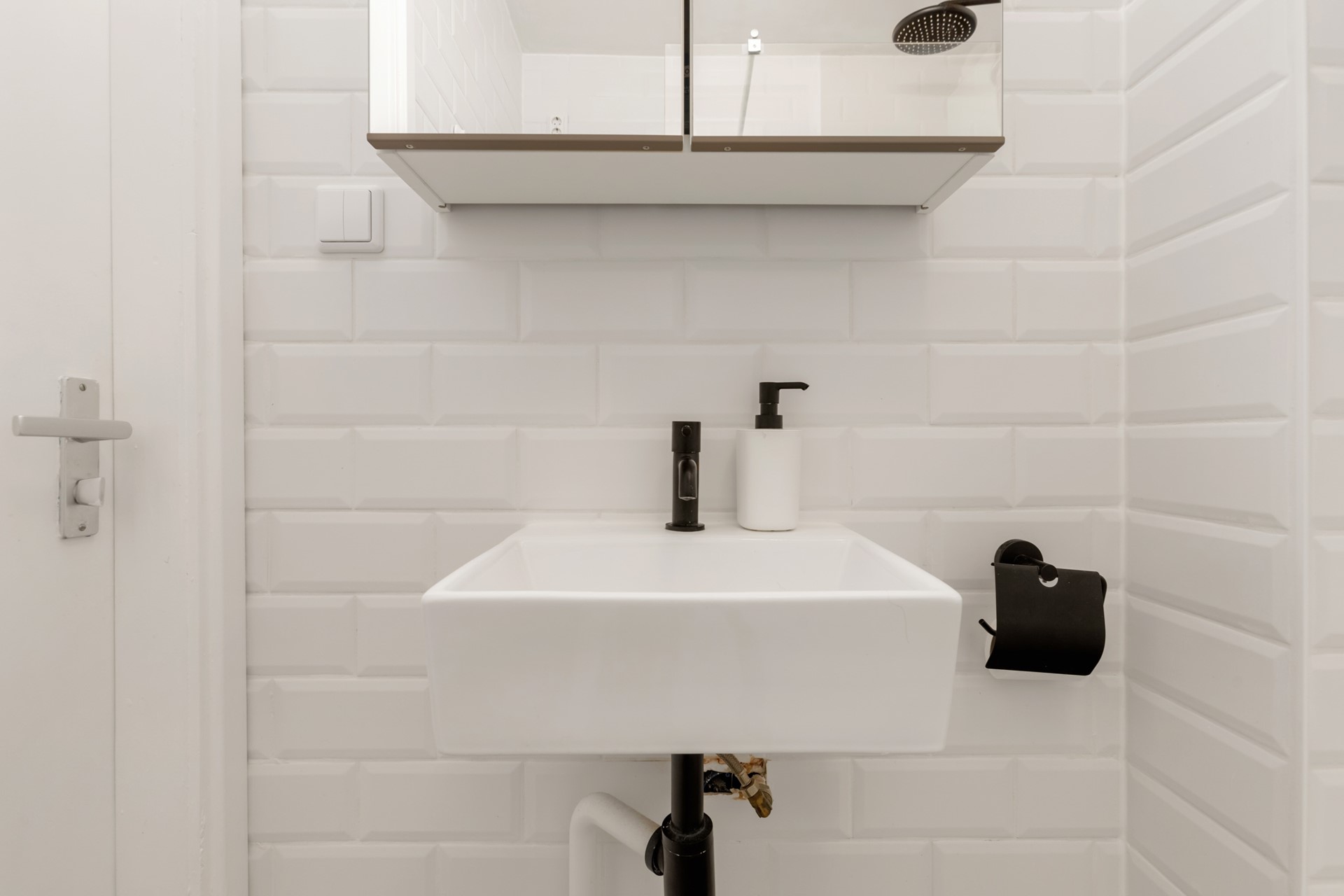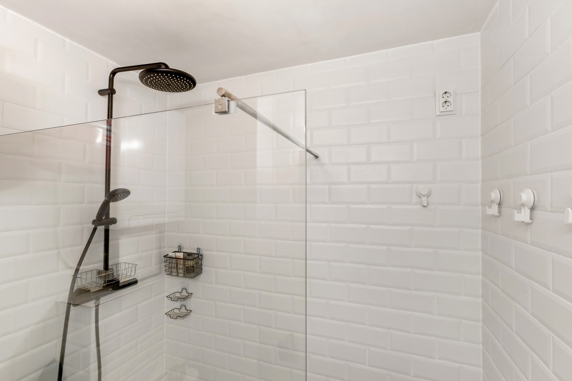 De recent vernieuwde badkamer is modern afgewerkt met lichte tegels en uitgerust met een inloopdouche, wastafel en toilet. De badkamer is stijlvol, comfortabel en praktisch.